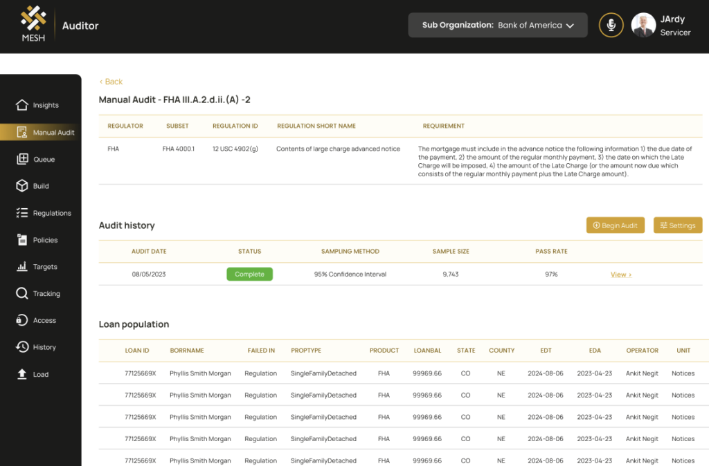 - Population identification – Auditor automatically identifies the relevant loan population subject to a given regulation